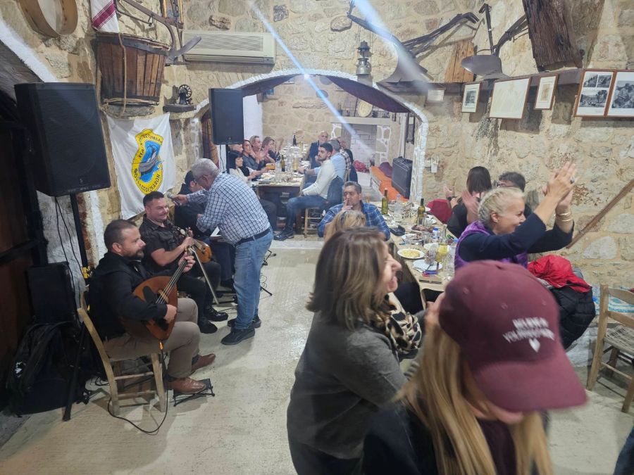 Στο φιλόξενο ρακοκάζανο του Στείρωνα, το γλέντι άναψε γρήγορα. Γι αυτό φρόντισε ο λυράρης Κωστής Σταυρακάκης και η παρέα του, εναλλάσσοντας κρητικά και λαϊκά μουσικά ακούσματα.